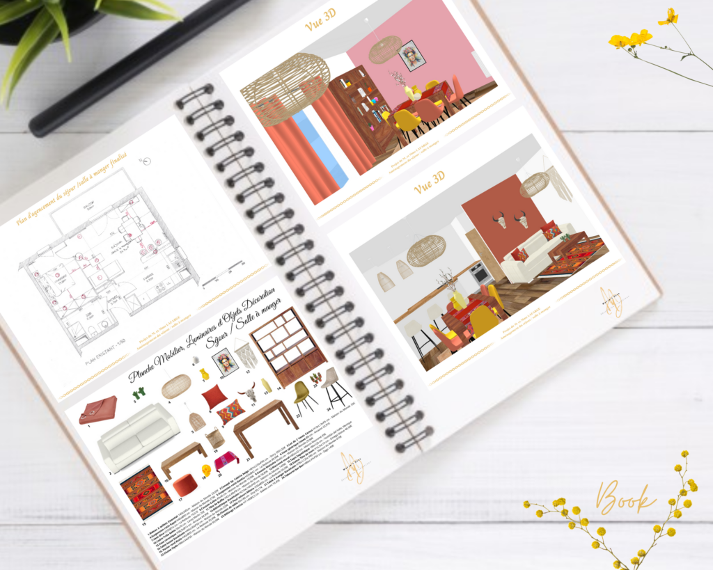 Le book déco est un dossier regroupant des documents qui vous permettent de vous projeter dans votre nouvel espace. C’est le fruit des annotations prises lors de notre premier rdv par rapport à vos attentes, besoins, budget et possibles contraintes relatives au lieu. Le book vous est remis 2 ou 3 semaines après notre rendez-vous.